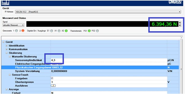 - Einstellen des Ladungsverstärkers: Der digitale Ladungsverstärker CMD600 ist hinsichtlich Messbereich und Verstärkung frei einstellbar. Die oben errechnete Empfindlichkeit ist in den Assistenten einzugeben. Der Messbereich sollte sinnvoll eingestellt werden, um eine optimale Auflösung zu garantieren.