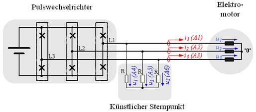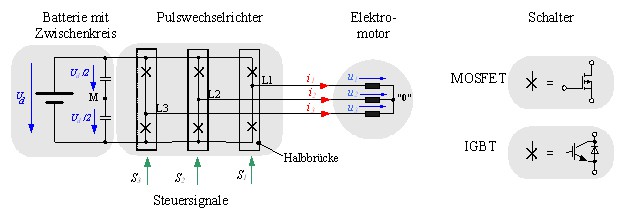 Bild 1.1 zeigt den Antriebsstrang eines solchen Elektrofahrzeuges. Die Gleichspannung der Fahrzeugbatterie wird über den dreiphasigen Pulswechselrichter in eine Drehspannung umgeformt und auf einen Drehstrommotor geschaltet. Als Leistungsschalter werden je nach Höhe der Batteriespannung unterschiedliche Leistungshalbleiter eingesetzt. Bei Batteriespannungen unter 100 V werden als Leistungshalbleiter MOSFET (Metal Oxide Semiconductor Field-Effect Transistor) und bei größeren Spannungen werden IGBT (Insulated-Gate Bipolar Transistor) eingesetzt. Als Elektromotoren werden üblicherweise Asynchron- oder Synchronmaschinen verwendet.