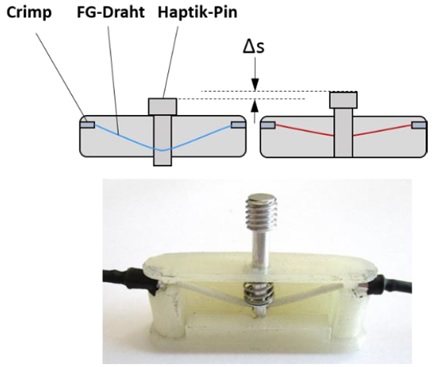 Wird ein Formgedächtniselement im martensitischen Zustand mechanisch verformt, so tritt beim Überschreiten einer kritischen mechanischen Spannung eine hohe Dehnung (bis ca. 8%) in Form eines Plateaus auf. Wird anschließend die Temperatur soweit erhöht, dass eine Phasenumwandlung von Martensit in Austenit eintritt erfolgt die Rückverformung des Formgedächtniselementes. Dieser Vorgang ist hysteresebehaftet und reversibel [1]. Auf diese Weise kann man den in Abbildung 1 (links) dargestellten Formgedächtnisdraht unter Last zwischen dem Zustand 1 und 2 hin- und herschalten, indem man ihn elektrisch aufheizt. Während der Materialumwandlung ist eine auch signifikante Änderung des elektrischen Widerstandes feststellbar.